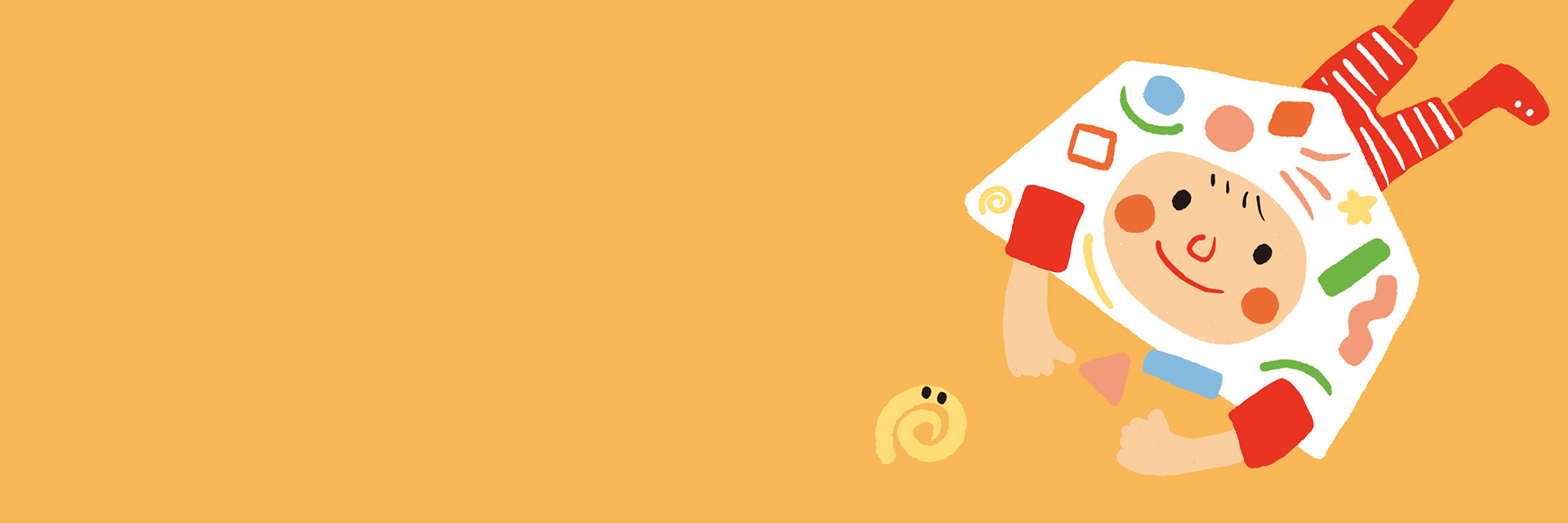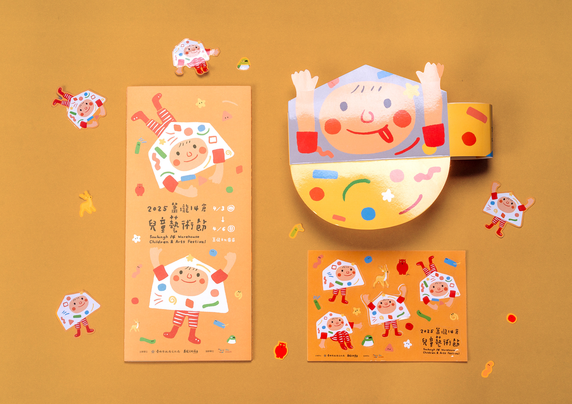 創造套著倉庫頭套的兒童作為主角,象徵兒童進入蕭壠文化園區這個場域。趴著玩玩具的肢體動作是兒童常會有的姿勢,地上各形各狀的玩具是藝術的能量與元素,藉由遊玩體驗,進行兒童藝術的洗禮。